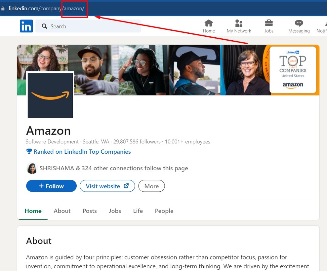 Then, upon checking the URL, you can locate the LinkedIn ID of the company following the string "/company/", which, in our case, is "amazon".